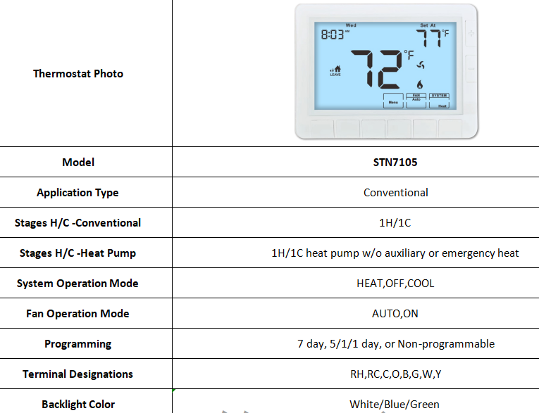 The STN7105 serves as a versatile Digital Thermostat Controller, compatible with conventional heating and cooling systems. It supports a 1H/1C heat pump configuration without auxiliary or emergency heat, making it an efficient Engine Thermostat option for various HVAC setups.