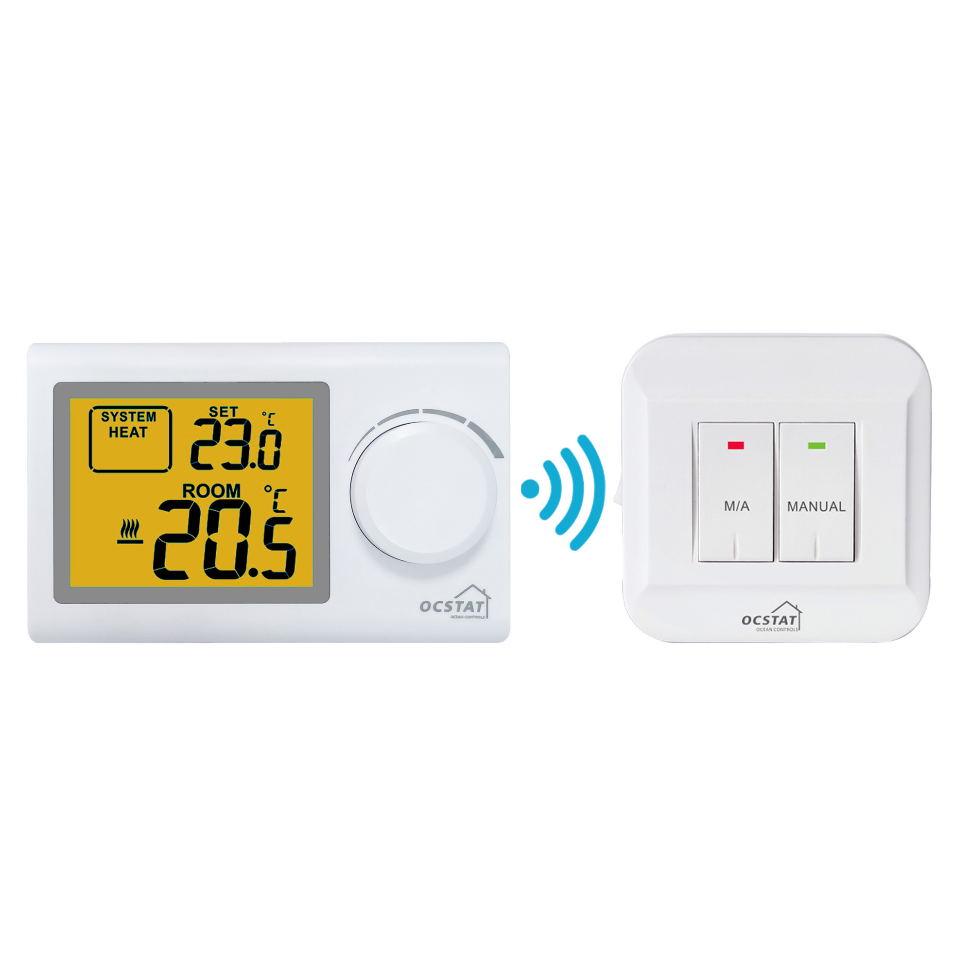 A1: The Wireless Room Thermostat is from the brand OCSTAT, and the model number is ST2401RF.