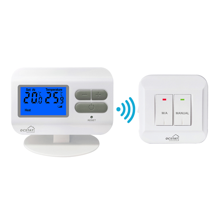 A1: The wireless room thermostat is from the brand OCSTAT and the model number is ST2301RF.